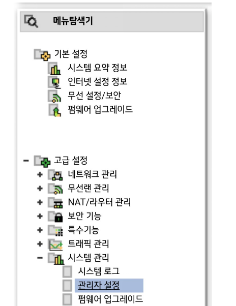 아까 암호를 설정할 때는 기본 설정의 무선 설정/보안 탭에 들어갔는데, 이번에는 메뉴 탐색기의 고급 설정 - 시스템 관리 - 관리자 설정에 들어갑니다.