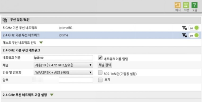 보통 WPA2PSK + AES 채널이 권장채널입니다. 먼저 인증 및 암호화를 권장 채널로 설정한 이후 설정할 와이파이 암호를 입력하면 됩니다. (8자리 이상의 문자나 숫자) 만약 제대로 암호를 입력했는지 궁금하실 경우 우측에 있는 보기에 체크하시면 입력한 암호 확인이 가능합니다. 참고로 상단의 네트워크 이름을 변경하면 와이파이 이름도 바꿀 수 있으니 언제든 쉽고 편하게 이름을 바꿀 수 있으며, 네트워크 이름은 한글, 영어, 숫자 모두 가능합니다.
