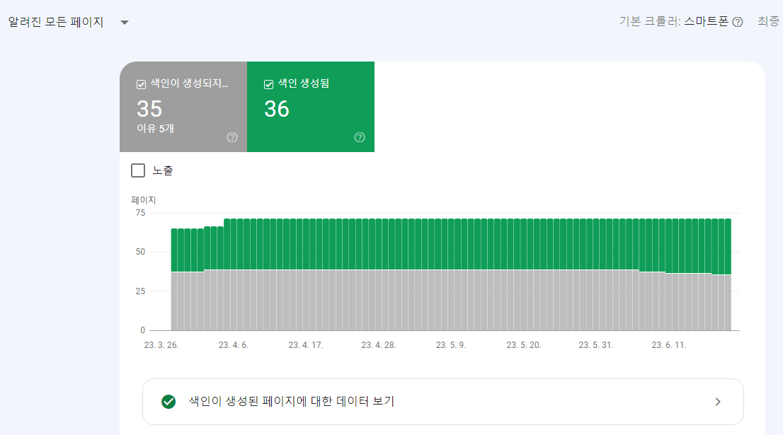 구글 서치 콘솔 색인 생성 요청 후의 결과를 살펴보면, 제 블로그에 작성된 글을 하나씩 구글 서치 콘솔에서 색인 생성 요청한 후 3일 정도 지난 뒤에는 유효한 색인이 크게 증가하고 글이 구글에 노출되기 시작했습니다.