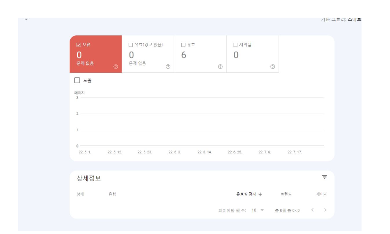 오늘은 티스토리 블로그를 시작한 지 얼마 안 되었거나 기존에 운영하시는 분들께 '구글 서치 콘솔 색인 생성 요청'의 중요성에 대해 알려드리고자 합니다. 티스토리 블로그를 시작한 지 얼마 안 된 상태에서 구글 서치 콘솔에 접속하여 '색인 생성 범위'를 확인했더니 유효한 색인이 단 6개밖에 되지 않았습니다.